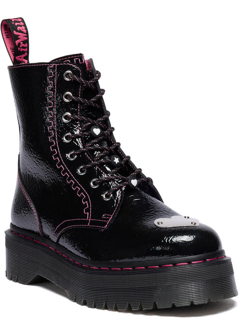 Jadon versetzt dich in die 90er Jahre mit ihrem glänzenden, distressed Lack und der Plattformsohle! Mit einem kawaii-tauglichen metallenen Herzchen an der Spitze, rosa Futter und rosa Stichen ist sie alles andere als unauffällig. Ob zu einer Hose oder einem Kleid, auf einem Festival oder im Büro: Du und deine Docs seid bereit, die Welt zu erobern!