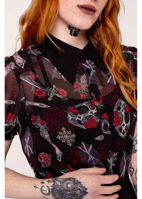 Diese Chiffonbluse ist semi-transparent und leicht, aber die Ausstrahlung ist alles andere als sanft: der Clarimond-Druck mit Schwertern ist messerscharf und der schwarze Spitzenkragen verleiht ihr eine straffe, scharfe Note. Dies ist die Bluse, die deinem Outfit sofort eine alternative Kante verleiht - bist du bereit, deinen Stil zu schärfen?