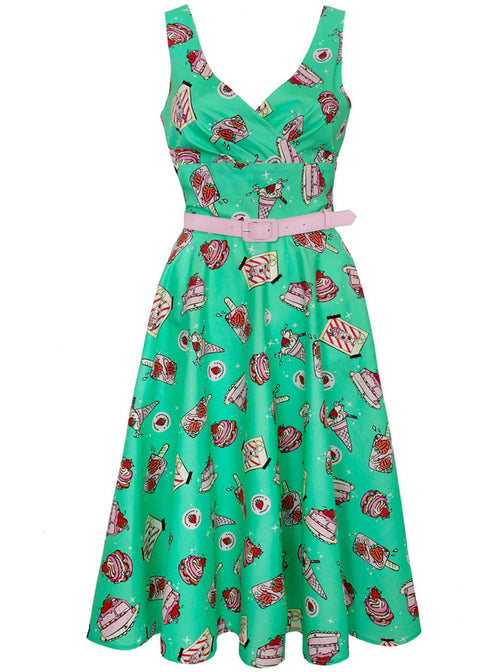 Das Retro-Modell hat einen schönen V-Ausschnitt mit breiten Trägern und einen schwingenden Rock, der sofort zu tanzen beginnt, sobald du einen Schritt machst. Der zartrosa Gürtel setzt dem Ganzen das „i-Tüpfelchen“ auf. Hast du schon Lust auf Süßes?