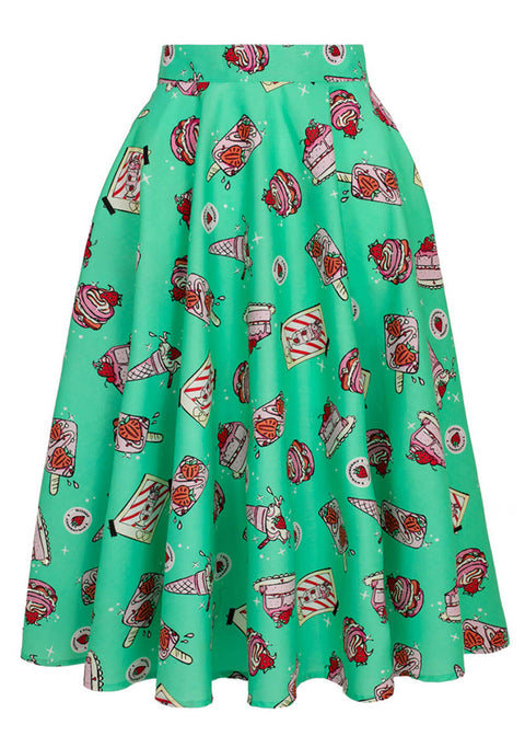 Auf diesem frischen grünblauen Grund tanzen fröhlich Eiscremes, Tortenstücke, Cupcakes und Erdbeeren durcheinander, sodass jede Drehung zum Fest wird. Perfekt kombiniert mit einem einfarbigen Oberteil (damit der Print strahlen kann) oder mit einer passenden Farbe für einen echten Retro-Zuckerrausch. Bekommst du schon Appetit?