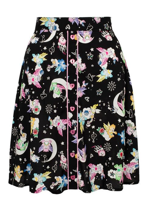 Dieses Rockstück kombiniert die niedlichen Care Bears mit regenbogen-spuckenden Totenköpfen für eine gehörige Portion süße Chaotik, fast so, als wäre ein Tattoo-Design zum Leben erwacht! Die herzförmigen Zierknöpfe machen es besonders auffällig und verleihen ihm noch mehr Persönlichkeit: ganz nach deinem Stil ♥