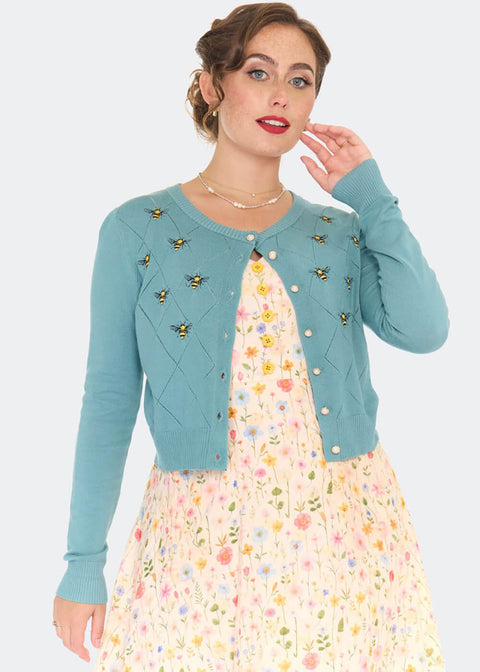 Über das Karomuster scheinen sie fröhlich umher zu schwirren, lebhaft auf einem weichen blauen Viskose-Strick eingestickt: bereit, dein Outfit (und deinen Tag) aufzuhellen! Vintage Sweetheart, Dopamin-Dressing oder einfach nur ein Fan von positiven Vibes: Dieses Schätzchen willst du nicht verpassen ♥